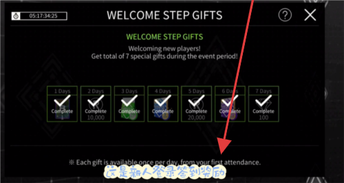 3、关注【WELCOME STEP GIFTS】新人签到,连续7天登录,领取每日奖励,积累资源提升卡牌等级(可升至50)。