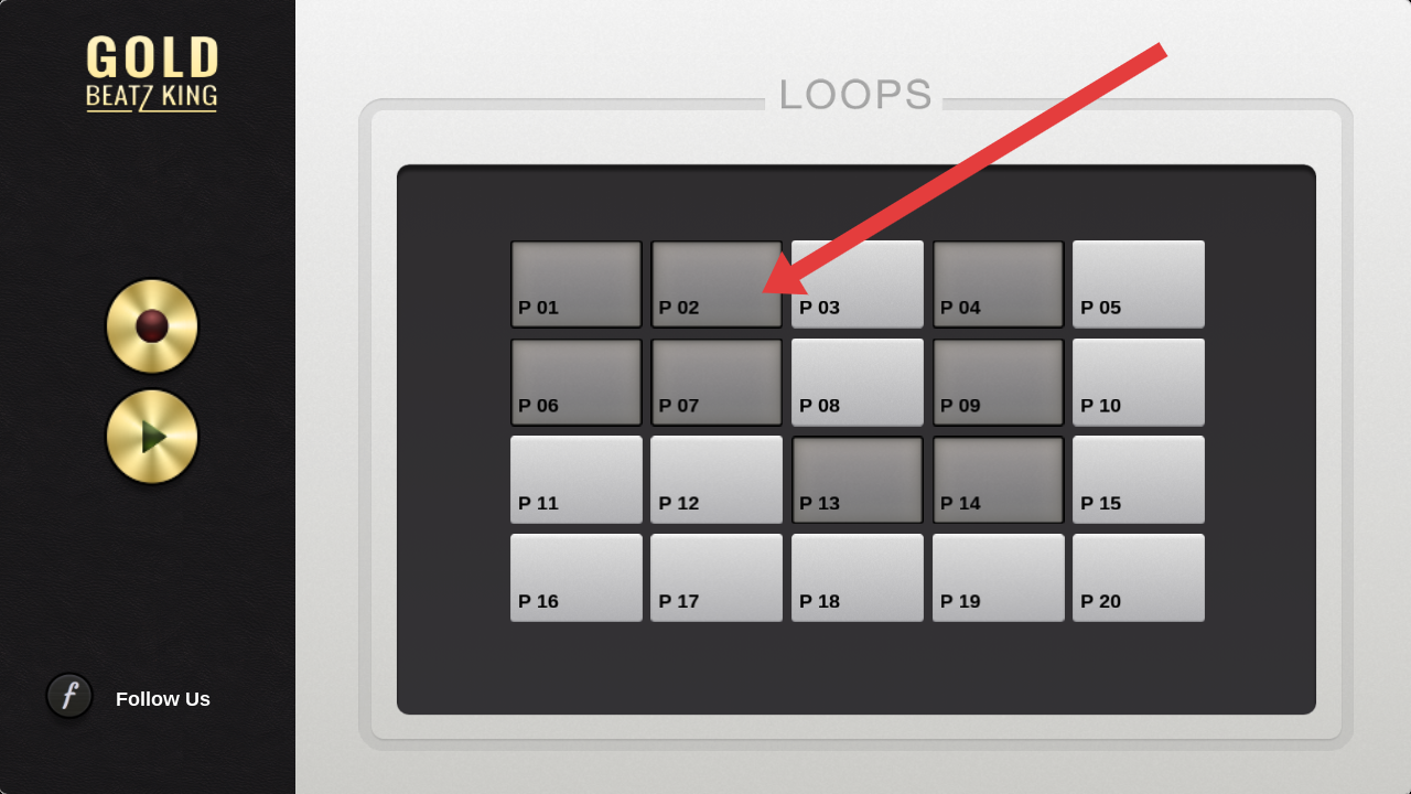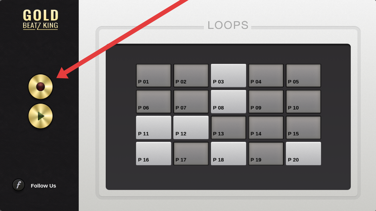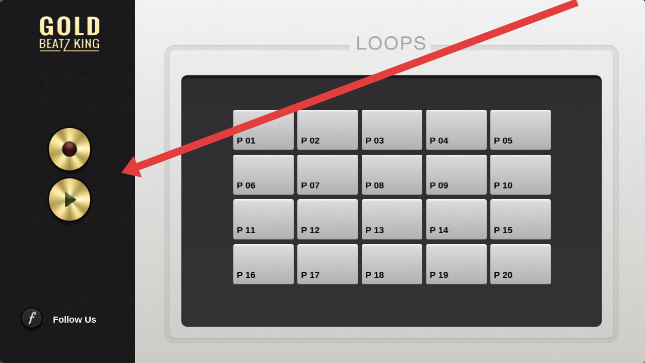 1、进入曲目列表界面,左侧金色按钮中,红色为录制键、绿色为播放键,点击P01-P20任意曲目方块,开始节奏循环创作。