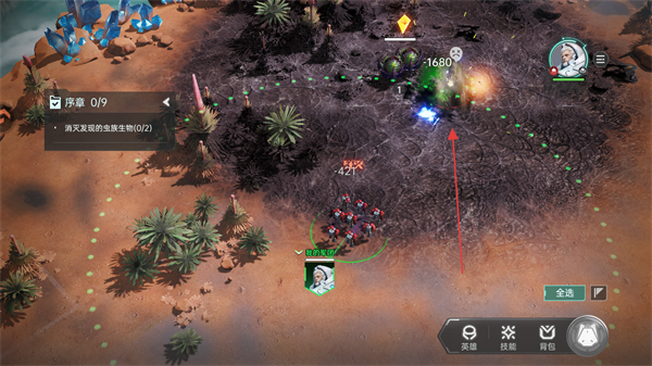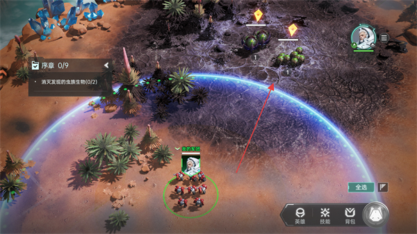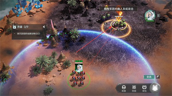 1、查看序章任务消灭2个虫族生物,点击移动指令操控军团向目标区域前进。
