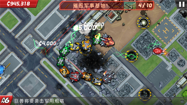 1、操控巨物沿路线移动,攻击军事基地的建筑、炮塔等目标,获取金币奖励。