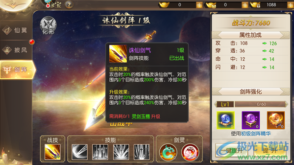 1、诛仙剑气:当前效果为攻击时20%的概率触发诛仙剑气,对范围内3个目标造成200%伤害,冷却30秒,升级效果为攻击时20%的概率触发诛仙剑气,对范围内3个目标造成240%伤害,冷却30秒。