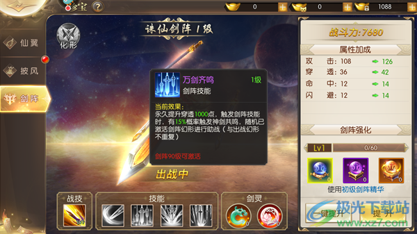 3、万剑齐鸣:永久提升穿透1000点,触发剑阵技能时,有15%概率触发神剑共鸣,随机已激活剑阵幻形进行助战(与出战幻形不重复)。