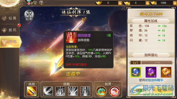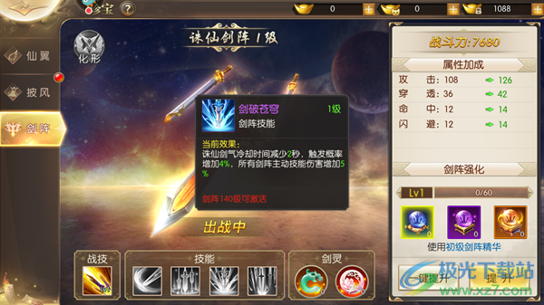 4、剑破苍穹:诛仙剑气冷却时间减少2秒,触发概率增加4%,所有剑阵主动技能伤害增加5%。
