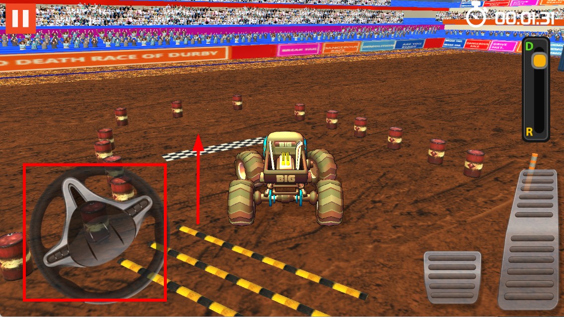 3、通过左侧方向盘,控制车辆转向,灵活调整方向,步入终点。