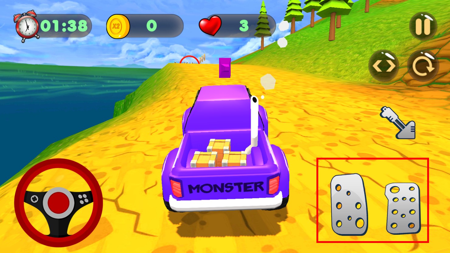 3、行驶时,点击右侧油门按键,可让紫色卡车加速,在赛道上前进。