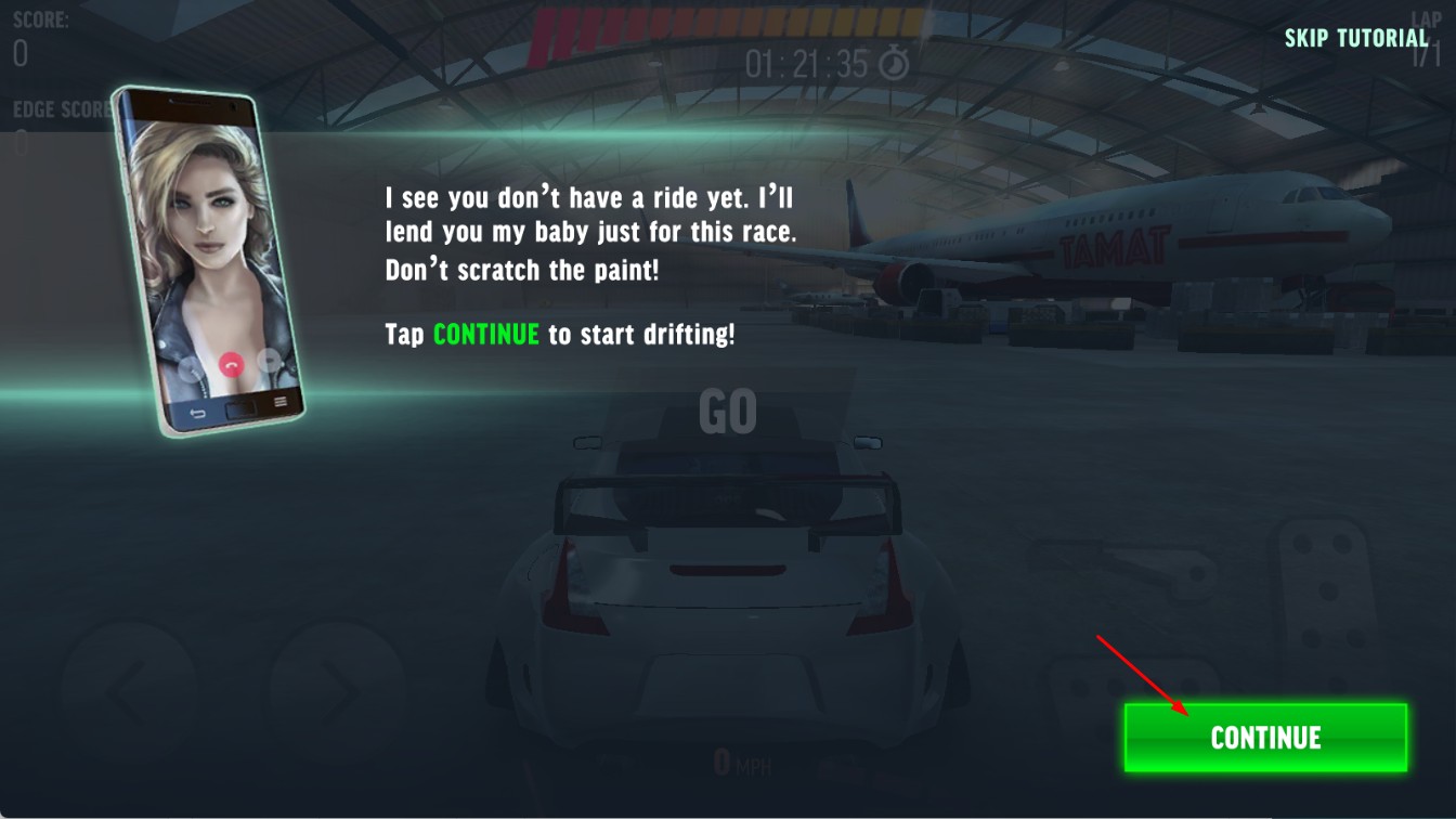 1、点击【CONTINUE】,进入【极限漂移冠军之战】游戏,开启机场机库赛道挑战。