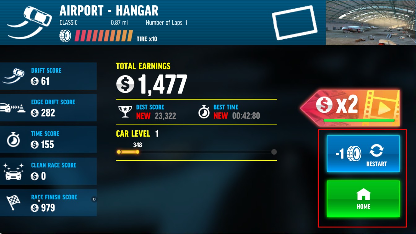 4、比赛结束后,可点【RESTART】重玩赛道,或点【HOME】返回主界面。