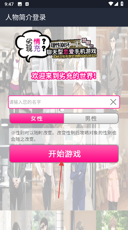 1、在《理性崩坏!?聊天型恋爱手机游戏》登录界面,输入名字,选择性别,点击【开始游戏】,进入游戏。