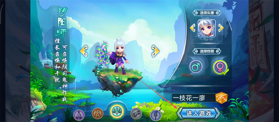 1、创建角色时,可选【阴阳师】职业,调整头像、性别,取好名字后点击【进入游戏】哦。