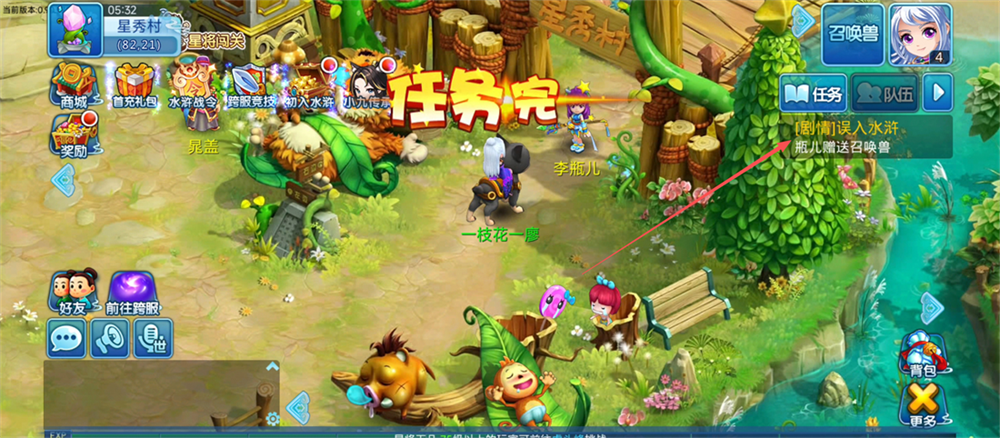 2、在星秀村完成剧情任务,点击【任务】面板,就能获得瓶儿赠送的召唤兽啦。