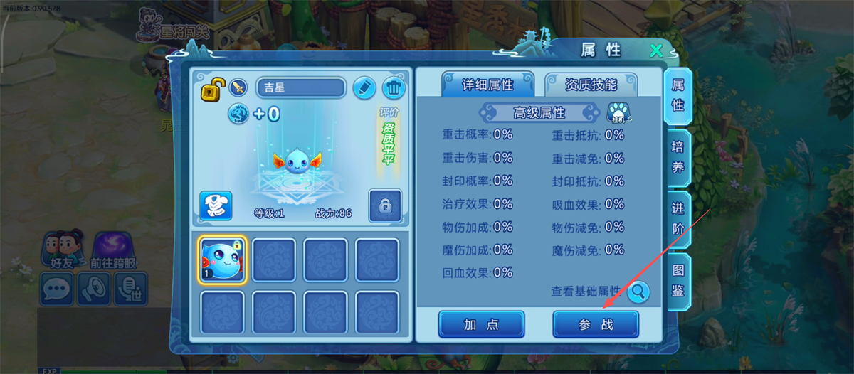 4、查看召唤兽【吉星】的属性后,点击【参战】按钮,让它伴随我们闯荡江湖呢。