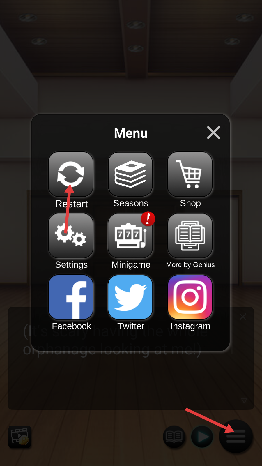4、通过菜单【Restart】功能,重置游戏进程,尝试不同选择,优化剧情体验路径。