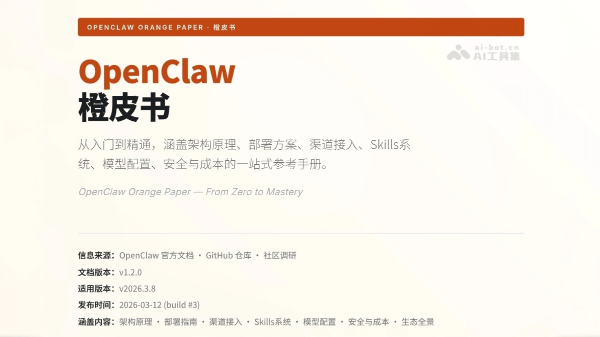OpenClaw橙皮书是全面掌握开源AI Agent系统的权威指南,详细解析OpenClaw三层架构、四层记忆系统和自扩展Agent设计。手册涵盖本地与云端部署方案、20+渠道接入实战、ClawHub技能生态及成本优化策略,适合开发者与技术人员系统学习。通过橙皮书PDF可获取OpenClaw核心技术原理与最佳实践,助您快速掌握这款能将AI转化为自主执行任务数字员工的创新平台。