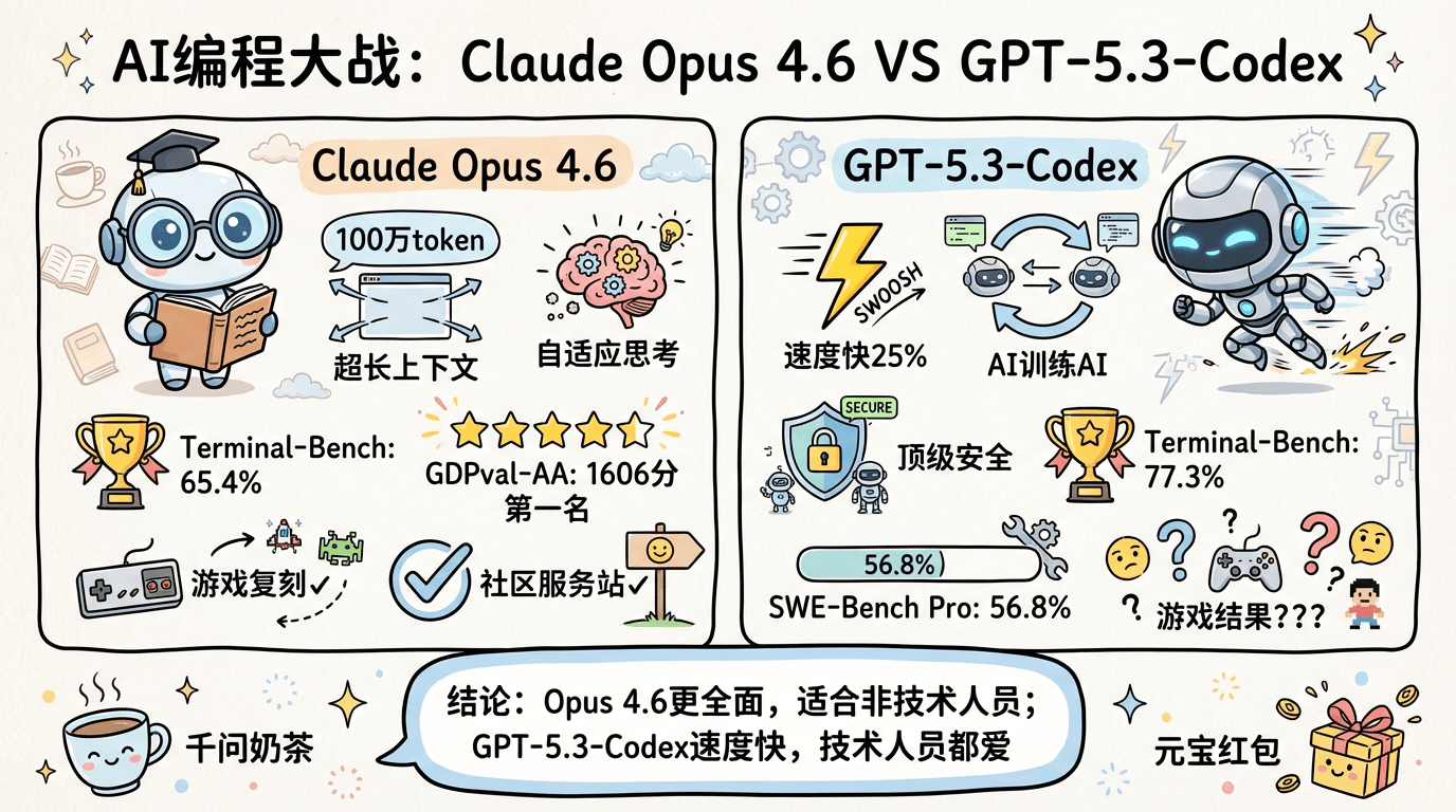 Claude Opus 4.6与GPT-5.3-Codex编程能力实测对比,两大AI模型在代码生成、任务规划等场景展开较量。Opus 4.6凭借100万token上下文窗口和自适应思考功能,在复杂任务处理表现优异;GPT-5.3-Codex则以快25%的速度和多任务并行见长。实测涵盖游戏复刻、社区服务设计等场景,展现AI编程从辅助到自主的技术突破,为开发者提供不同风格的技术路线选择。