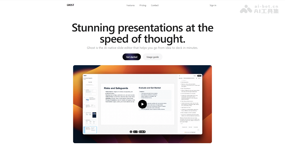 GHOST是一款AI原生PPT生成工具,通过智能技术快速将创意转化为专业演示文稿。该工具支持GPU加速和AI内容生成,提供流畅的编辑体验和实用功能如演讲者备注、一键导出等。适用于商业演示、学术报告和教育培训场景,帮助用户高效完成幻灯片制作。GHOST提供免费版和付费版本,满足不同需求,是提升工作效率的理想选择。