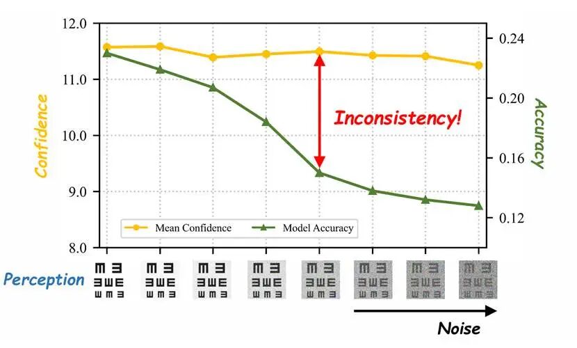 研究团队将上述现象定义为“感知钝化”(Perceptual Bluntness)。也就是,模型对视觉信息质量的变化缺乏敏感性,视觉证据已经明显退化,但置信度仍维持在高位。