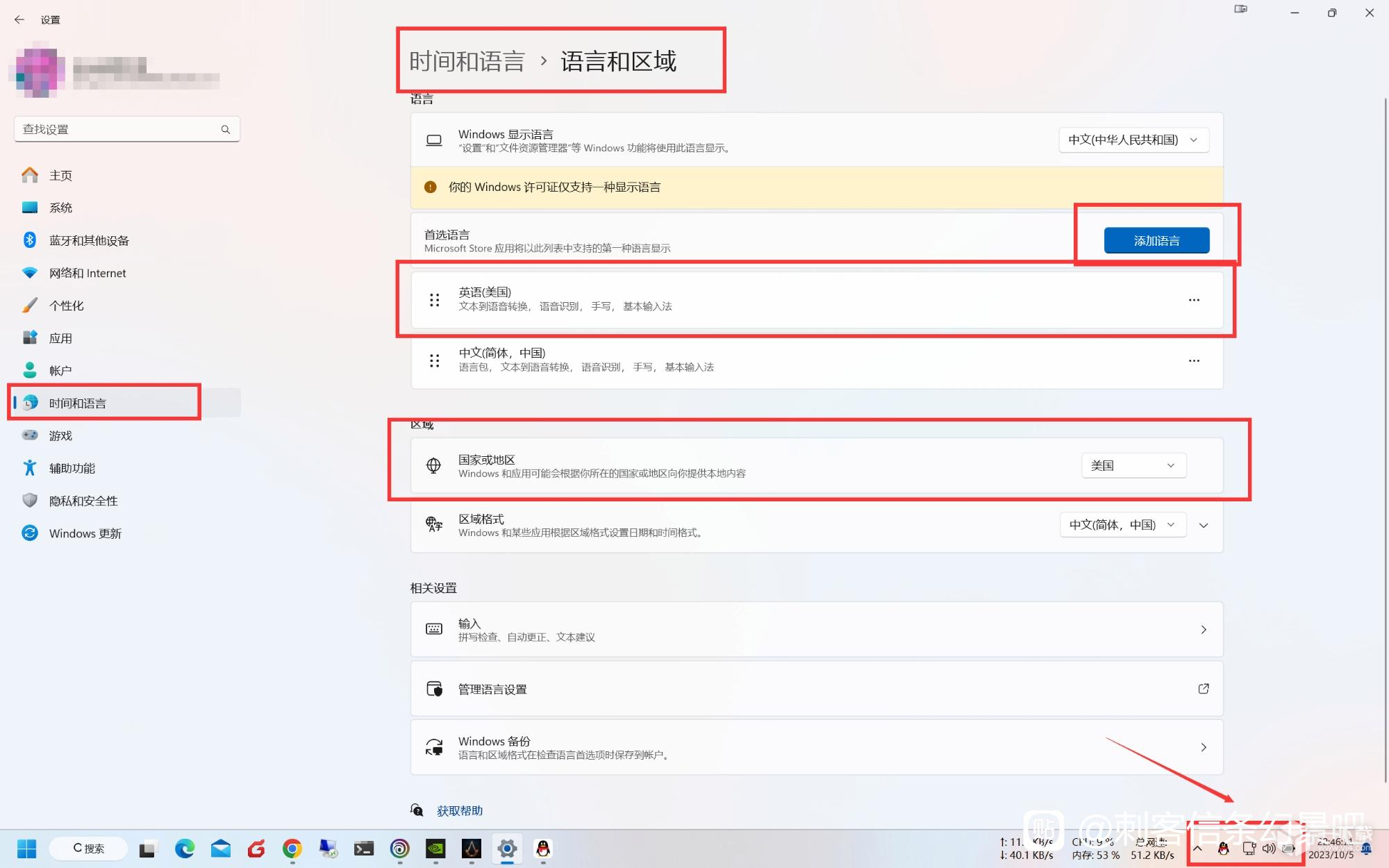 2,调整Windows系统设置,将第一语言改为“英语(美国)”,同时将输入法设置为英文输入(Windows 10/11快捷键为Win+空格)