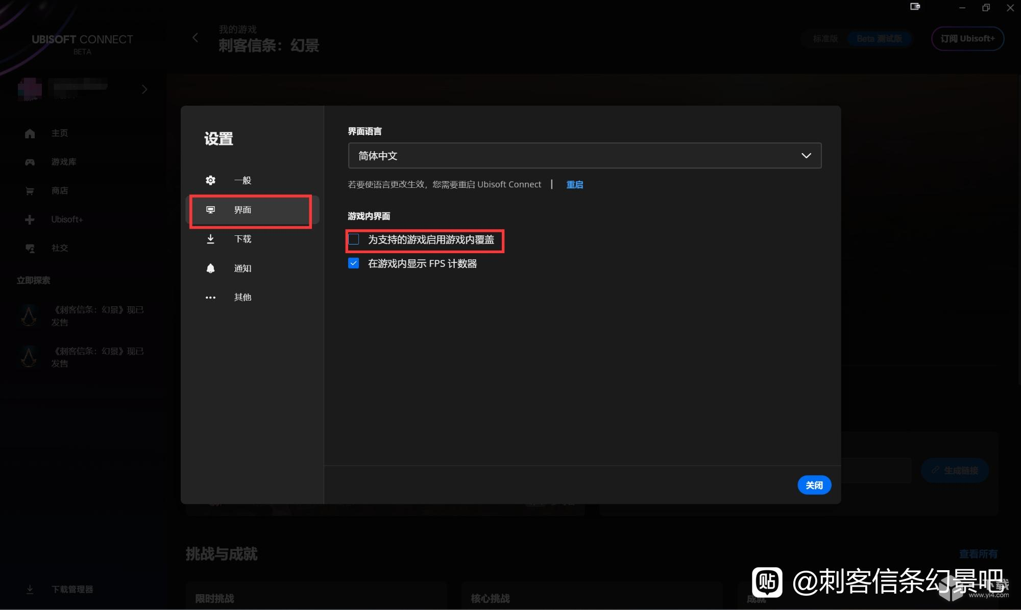 3,关闭UBISOFT CONNECT的游戏内重叠界面