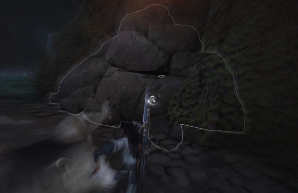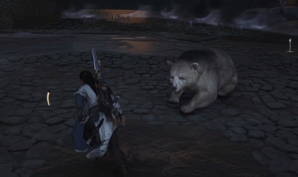 3、解开之后就可以下来打厚皮白化黑熊了,要采用乾坤挪移把熊摔到石头上才行。