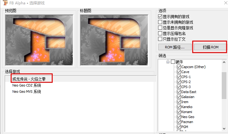 2.点击载入游戏,显示拥有的游戏,然后扫描ROM,之后可以看到成龙传说-火焰之拳