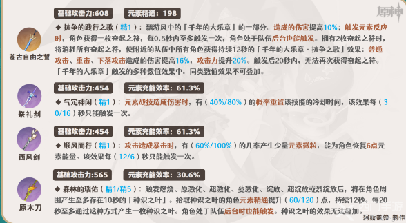 ①苍古自由之誓:因为风元素必定后手触发元素反应的机制,使得琳妮特的元素爆发发生元素转化后可以轻松触发该武器的被动特效,进而提高队伍伤害。