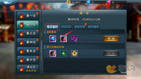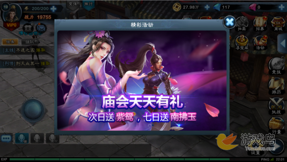 只要连续登录2天即可在庙会的登录奖励中领取共计100个紫鸳碎片,合成侠客紫鸳。紫鸳为远程侠客,射程、攻速、输出俱佳。绝技具有聚怪效果,出场技则可衔接绝技做到一波清屏。
