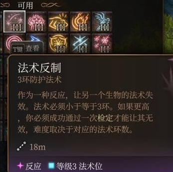 法术反制是一个必学的神技,区区三环法术但其上限极高,游戏内通过升环施法可以在敌方回合无副作用稳定反制敌方的强力六环法术,还有就是法师的反应一定要全设成手动的防止其他反应把法反盖过去。