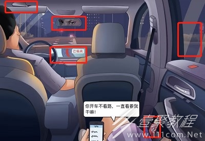 3、接着进入车子里面,点击自己的手机还有汽车导航,司机头上面的匕首,接着点击车窗、后视镜、包里的防狼喷雾;