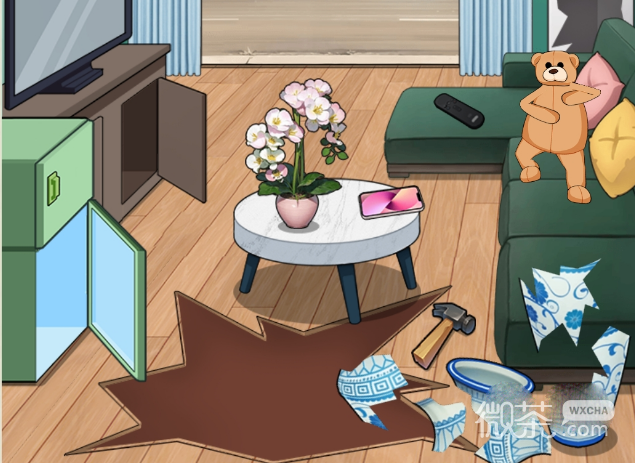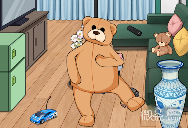 1、就你会玩文字跳舞小熊,需要找出999个跳舞小熊,首先点击画面中的小熊,再用锤子砸烂花瓶