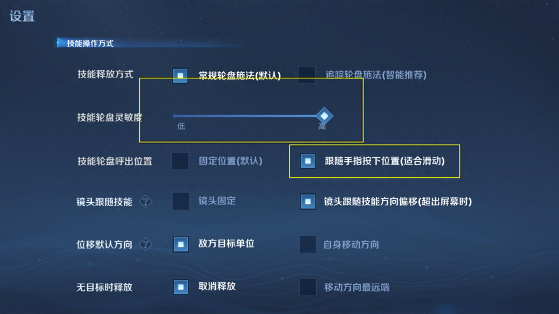 再将技能轮盘灵敏度拉满,并且将呼出位置,调整为跟随手指按下位置。