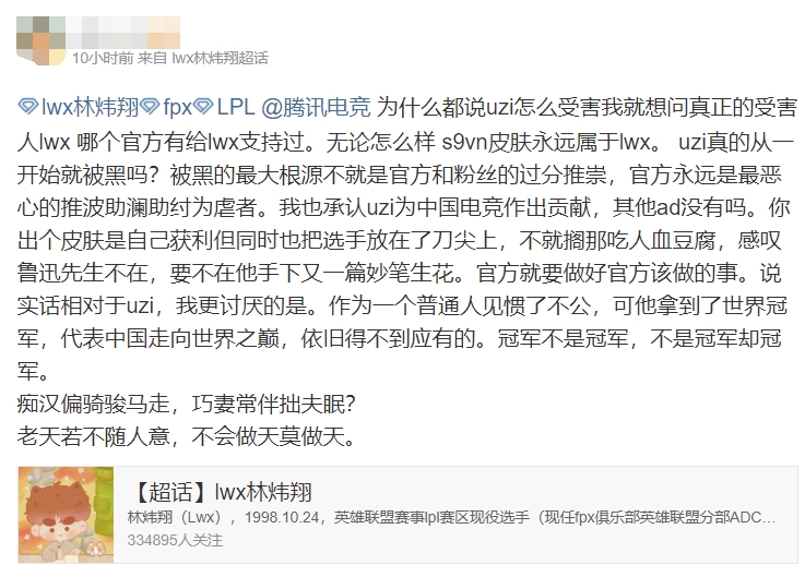 9月18日讯 英雄联盟官方公布了LPL十大选手纪念臻彩皮肤,Uzi选手的薇恩臻彩遭到S9冠军FPX薇恩皮肤拥有者Lwx粉丝不满,持续在超话为Lwx鸣不平。