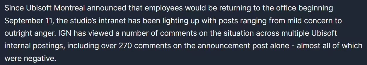 根据一位已经离职的育碧员工在社交媒体上的叙述,育碧蒙特利尔的领导层与团队经理开会,坚决要求所有员工自 9 月 11 日起“每周至少在办公室工作两天”,唯一的弹性政策是为期八周的特情容许,允许员工提供 “证明”以表明他们需要时间来适应这一新政策。