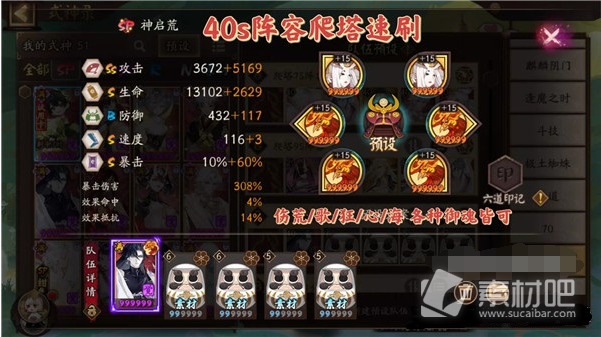 3、难民级别:攻攻爆伤荒/歌/狂/海/心(70暴)各种御魂都可用+4白蛋即可。