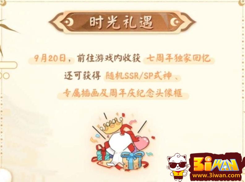 2、通过七周年时光机查看过去一年的游戏记录,分享记录可以随机获得一位SP/SSR式神、专属插画以及七周年纪念头像框。
