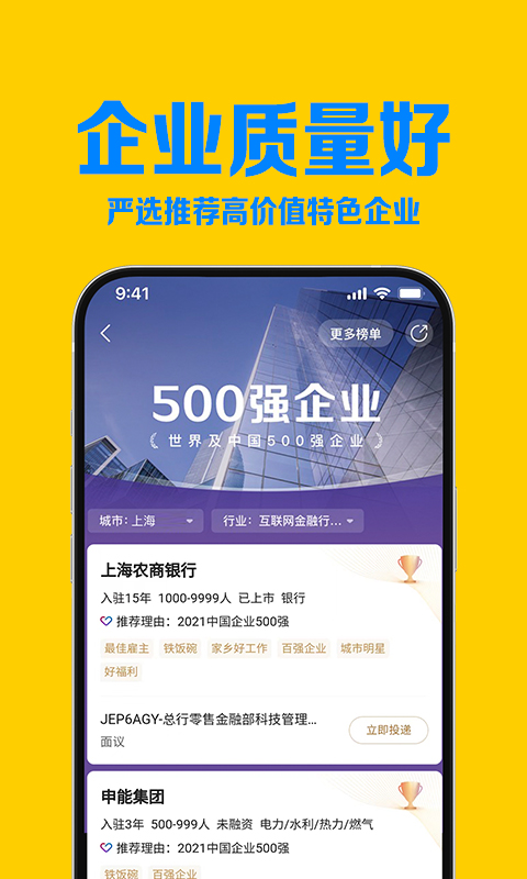 这款汇博人才网是在我国国内属于一款综合性的求职招聘软件。首先对于求职者方面,在这里可以对企业做到精准的匹配。用户可以在这里快速浏览各种不同工作岗位提供的职位信息,而且随时随地能够与在线儿的企业hr聊天,其中在这个平台上覆盖的职位行业包括了互联网,制造,汽车,房产广告传媒,金龙等等。而且职位是更加真实可靠的。