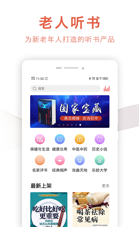 比较适合老年人的一个听书神器,有各种养生保健和相声评书等等,由专业权威的团队精心打造,一键登录就可以开启自己的美好畅读之旅了,随意畅听各种精彩的内容和图书。