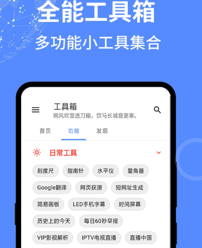 全能工具箱是非常专业的多功能平台,将办公类应用日常工具全部融合在一起,虽然app体积比较小,但功能强大又完善。其中包含并不经常使用的app,另外还有计算、查询、文件压缩、清理设备、图片等多种全面的工具满足。轻量的体积,无推送无广告,不再为广告所烦恼。