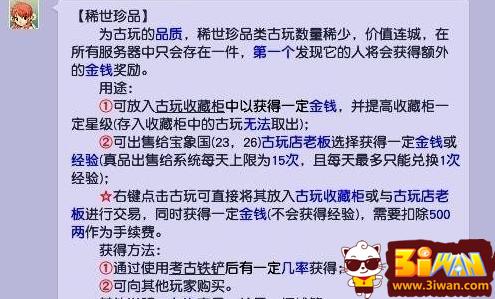 梦幻西游稀世珍宝为古玩的品质,稀世珍品类古玩数量稀少,价值连城,在所有服务器中只会存在一件,第一个发现它的人将会获得额外的金钱奖励。可以通过使用考古铁铲后有一定几率获得或可向其他玩家购买获得