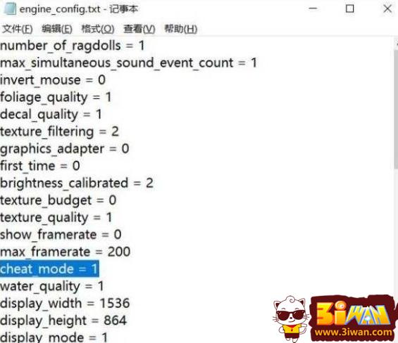 4.最后在engine_config的文本中找到cheat_mode = 0这条数据,将0改为1,再次进入游戏,就会发现游戏的作弊模式已经启动了。