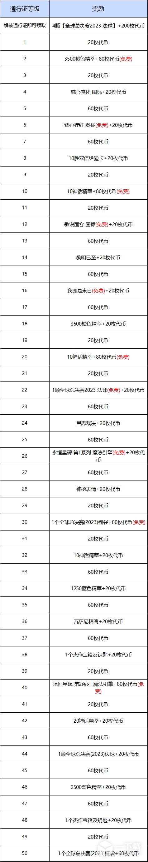 提升通行证里程碑可获得的免费奖励为:400个全球总决赛(2023)币、1个全球总决赛(2023)法球、惑心感化 图标、萦心猩红 图标、表情 我即是末日与1个永恒星碑 第1系列 魔法引擎。