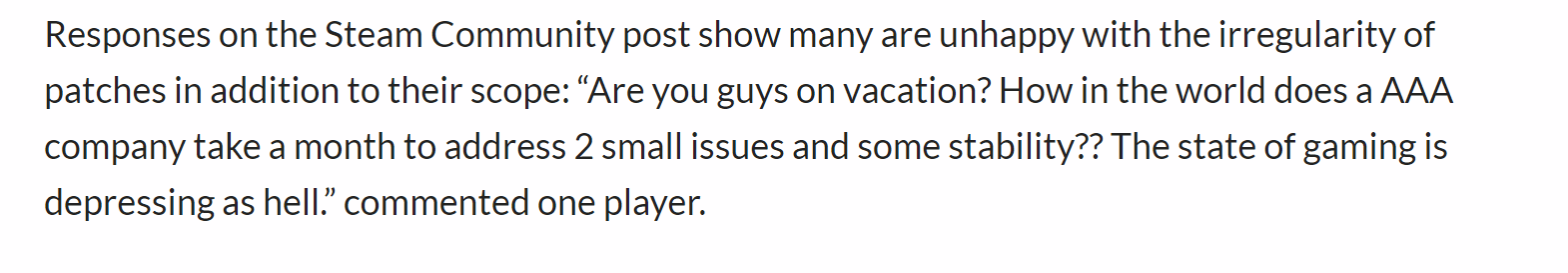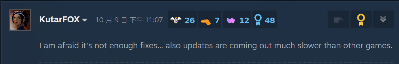 在Steam社区的评论区,玩家们表达对这个补丁规模的不满。有玩家表示,贝塞斯达的开发者似乎是在度假,花费了近一个月的时间只解决了两个小问题和一些系统稳定性的改进。他对游戏行业现状感到沮丧。