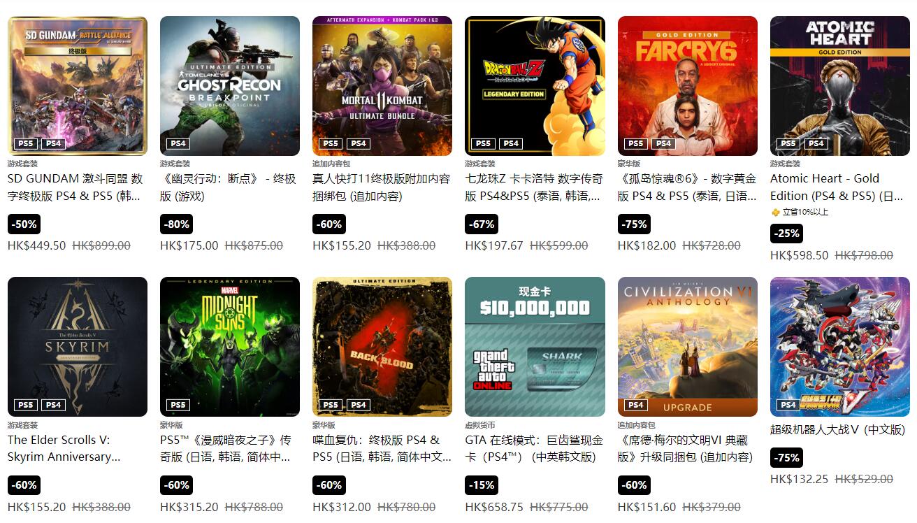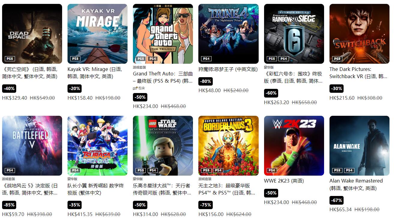 PS港服今日开启了秋季优惠促销活动,低至2折,众多大作迎来史低价和新史低:《星球大战绝地:幸存者》新史低65折,仅需356.85港币,《死亡空间:重制版》6折新史低,仅需329.4港币。《孤岛惊魂6》平史低25折,仅需182港币,《荒野大镖客2》平史低33折,仅需154.44港币。