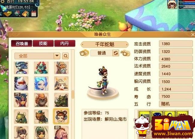 千年蛇魅是非常好的召唤兽;千年蛇魅的参战等级是75级,天生技能有敏捷、毒、偷袭和高级吸血,是非常好的新区过渡宠和押镖宠,天生基础满资质、满属性、满技能的状态如下图所示。