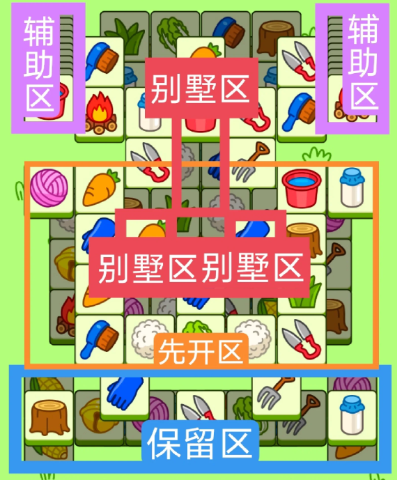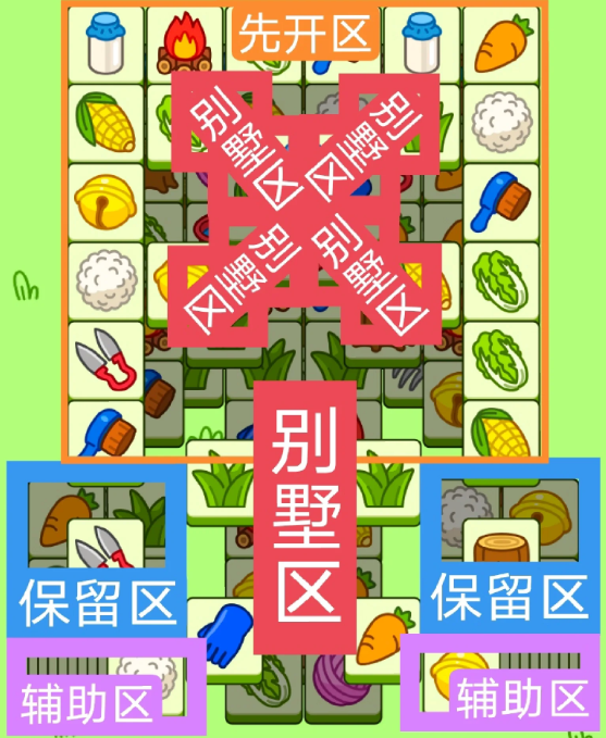 一个T字形大别墅,两个小三角型大别墅,开局先消除橙色区,然后按照一层层均匀消除表面牌, 哪里压牌比较多就先消除哪里,必要时可以用盲盒区辅助消除表面牌。尽量还是以别墅区内互相消除为主。蓝色区有叠牌,但是不多,全部保留到后期使用。