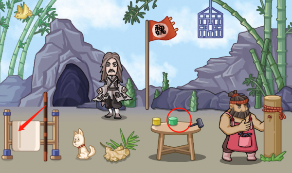 3、只要将桌子上的【锤子】拖动给男人,男人会将自己的手掌砸肥,就会变成【张飞】。