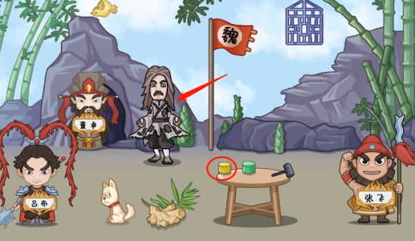 1、将桌子上的【黄色颜料】和【蓝色颜料】拖动合成,颜料就会变成【绿色】,再将绿色颜料拖动到左边的【布上】,【吕布】就会出现了。