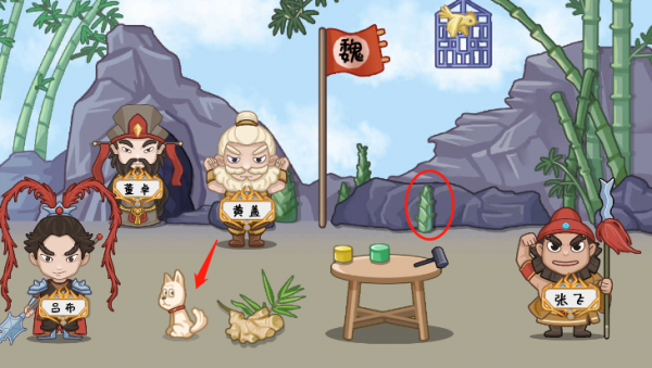 5、移动旗杆右边地上的【笋】,将其拖动到左下角【小狗】的身上,就会出现吴国人物【孙权】。
