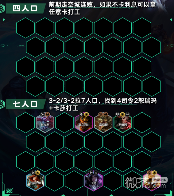 3-2/3-3阶段直接拉7人口,大搜阵容体系,优先找到4司令2恕瑞玛羁绊,如果没有内瑟斯,可以考虑用雷克顿代替,如果没有卡莎,可以考虑用尼菈打工过渡。