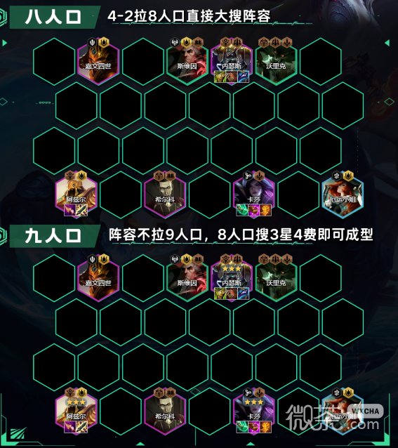 4-1/4-2直接拉8人口,大搜2星阵容体系。优先找到2星内瑟斯+2星卡莎。后期观察是否有同行追内瑟斯、卡莎、沙皇这三张牌,如果没有同行直接在8人口追3星4费。