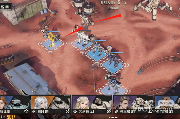 站位如下图所示,格兰特跟在马库斯后面,其他角色分散站位即可。马库斯的机兵强度是足够承担反击的,所以会是攻击泰坦的主力,格兰特跟在他后面主要税进行保护,后续还会要移动。